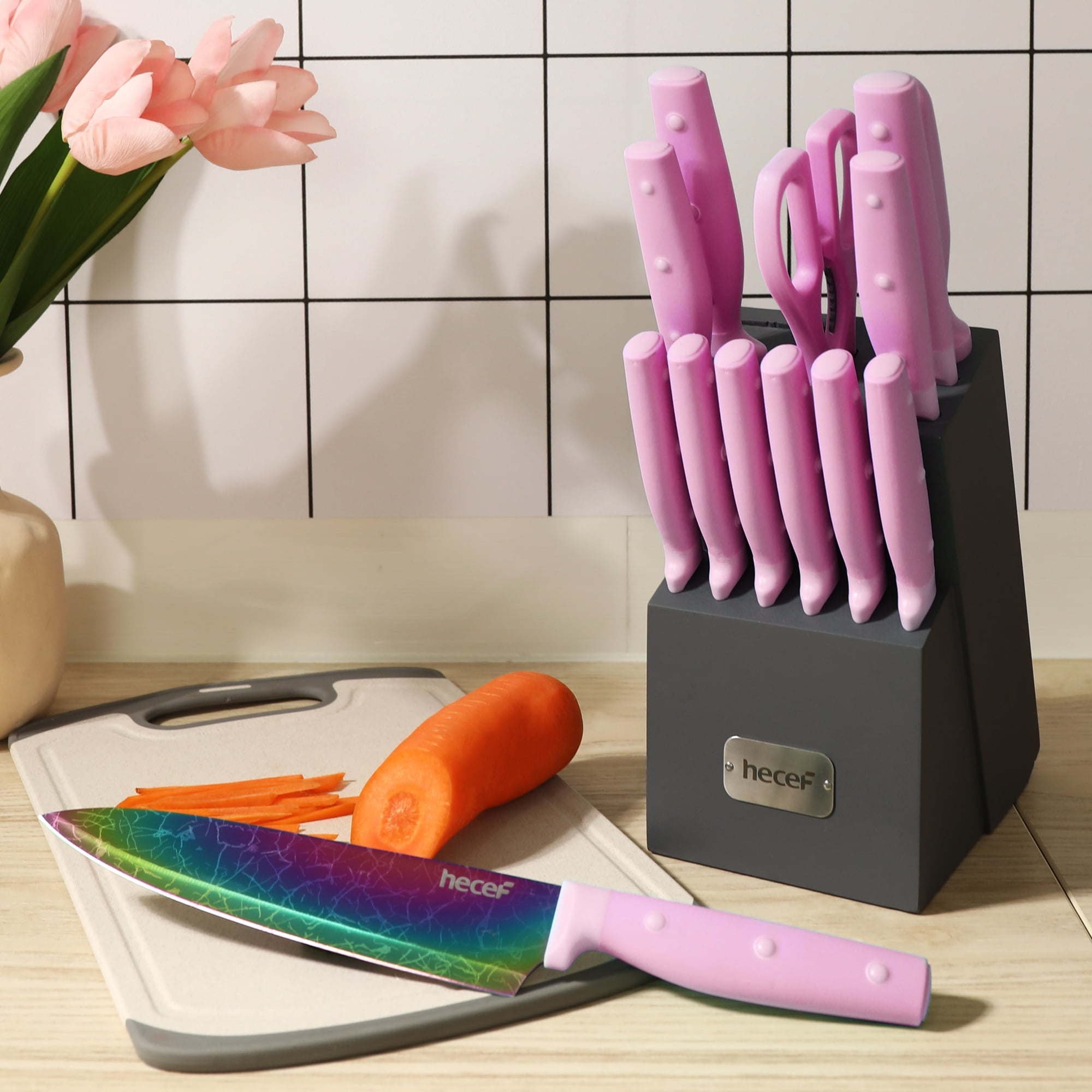 Home > Hecef 14-Piece Kitchen Knife Set with Wooden Block Sharpening Steel, Titanium Coating Rainbow Slicing Chef Knives