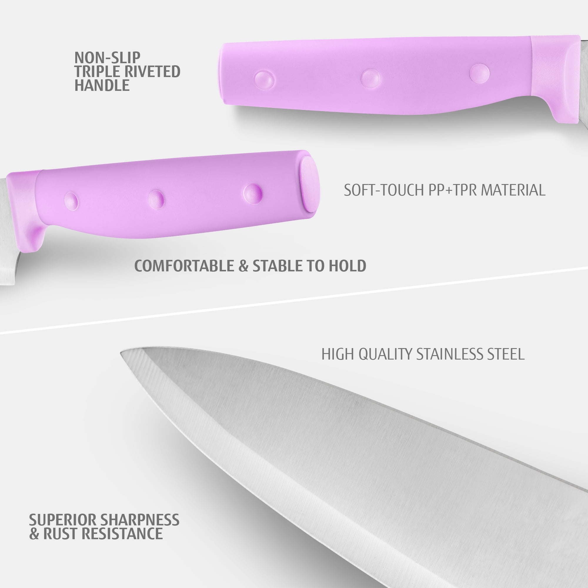 The 6 pieces pink knife set is made of high quality X30Cr13 stainless steel with a Rockwell hardness of 52�2 for improved corrosion resistance, rust resistance and remarkable durability, makes knives extraordinary performance in edge-retention, very durable and sharp.