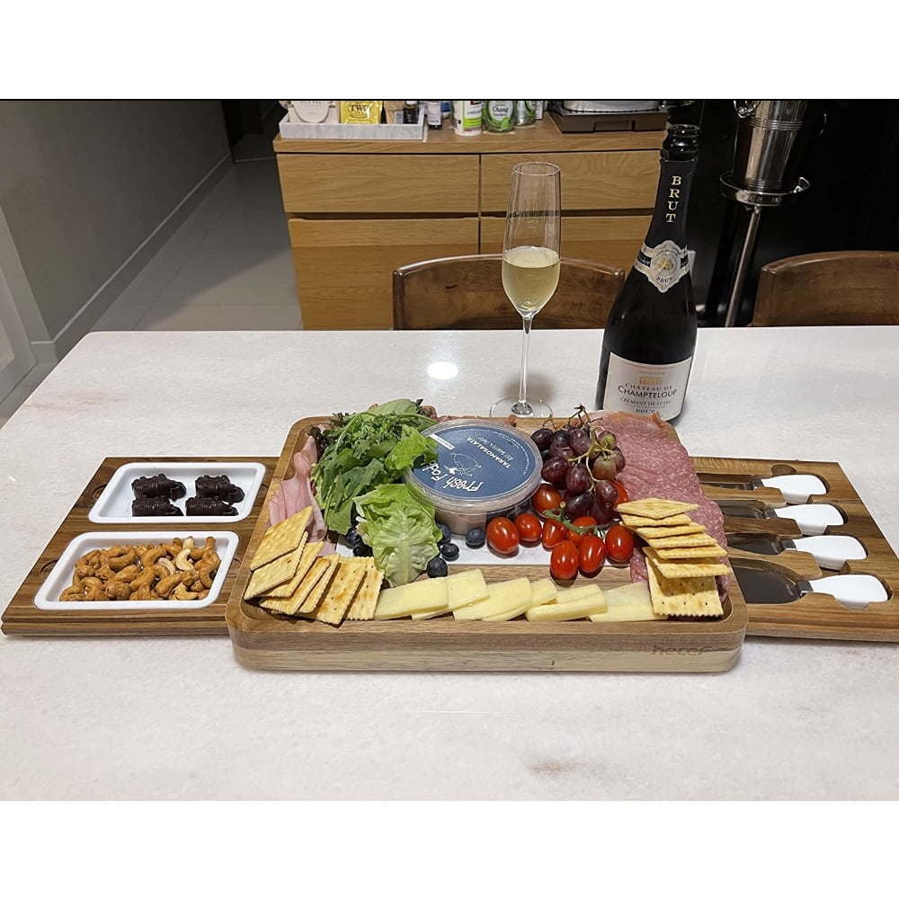 They are designed to hold its stainless steel cheese knives and removable silicone snack plates. Magnets keep the drawers from sliding out when closed, which is place-saving and will keep all things in order. Our cheese board set is bigger and more versatile than standard serving trays.