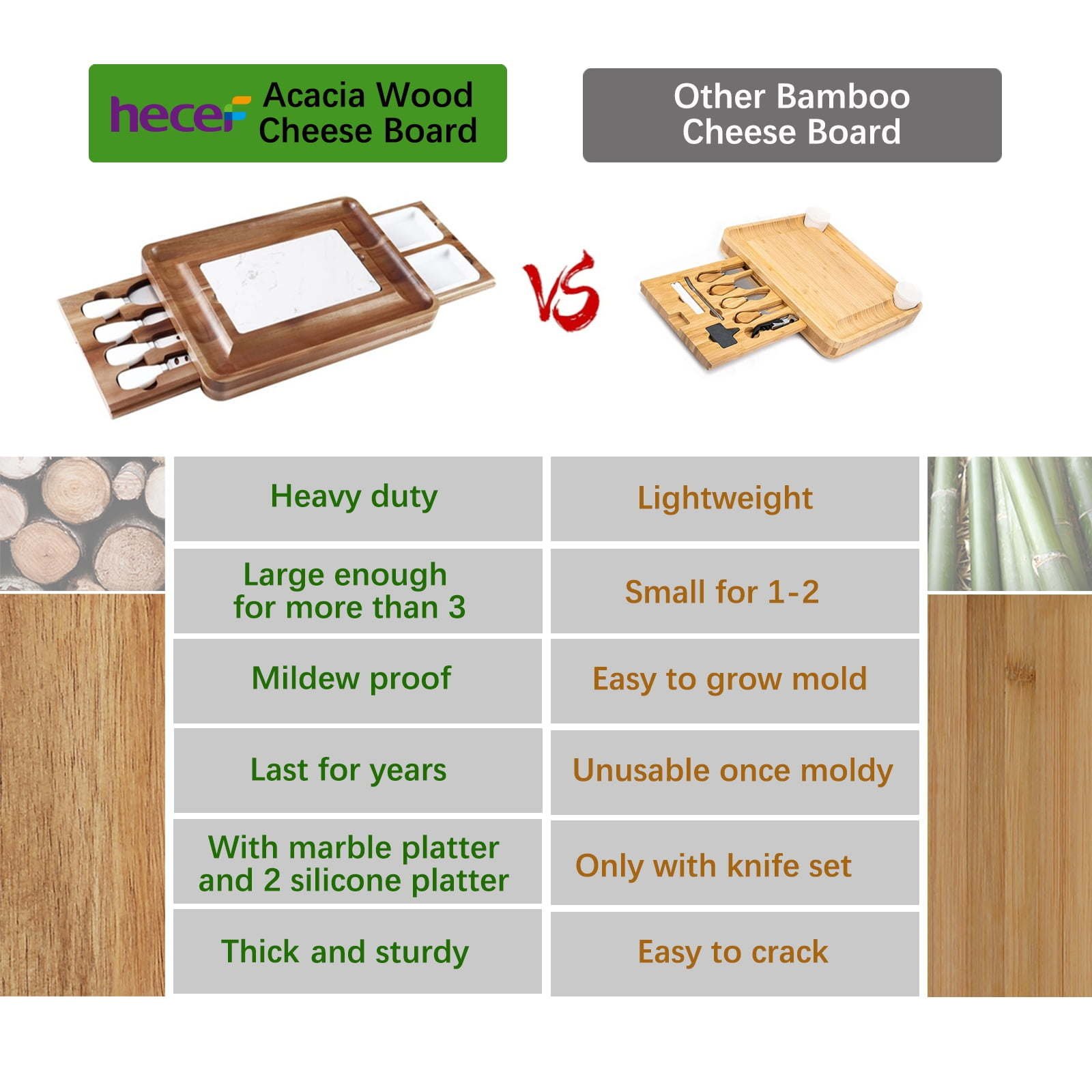 This cheese board is made from premium acacia wood, which is known for its rich, contrasting color and natural shine. Compared to other bamboo cheese board, acacia wood is more gorgeous, heavy duty and super durable. You can use it for years and years with proper care. it provides a pleasant aesthetic to any table or kitchen counter it is set on.