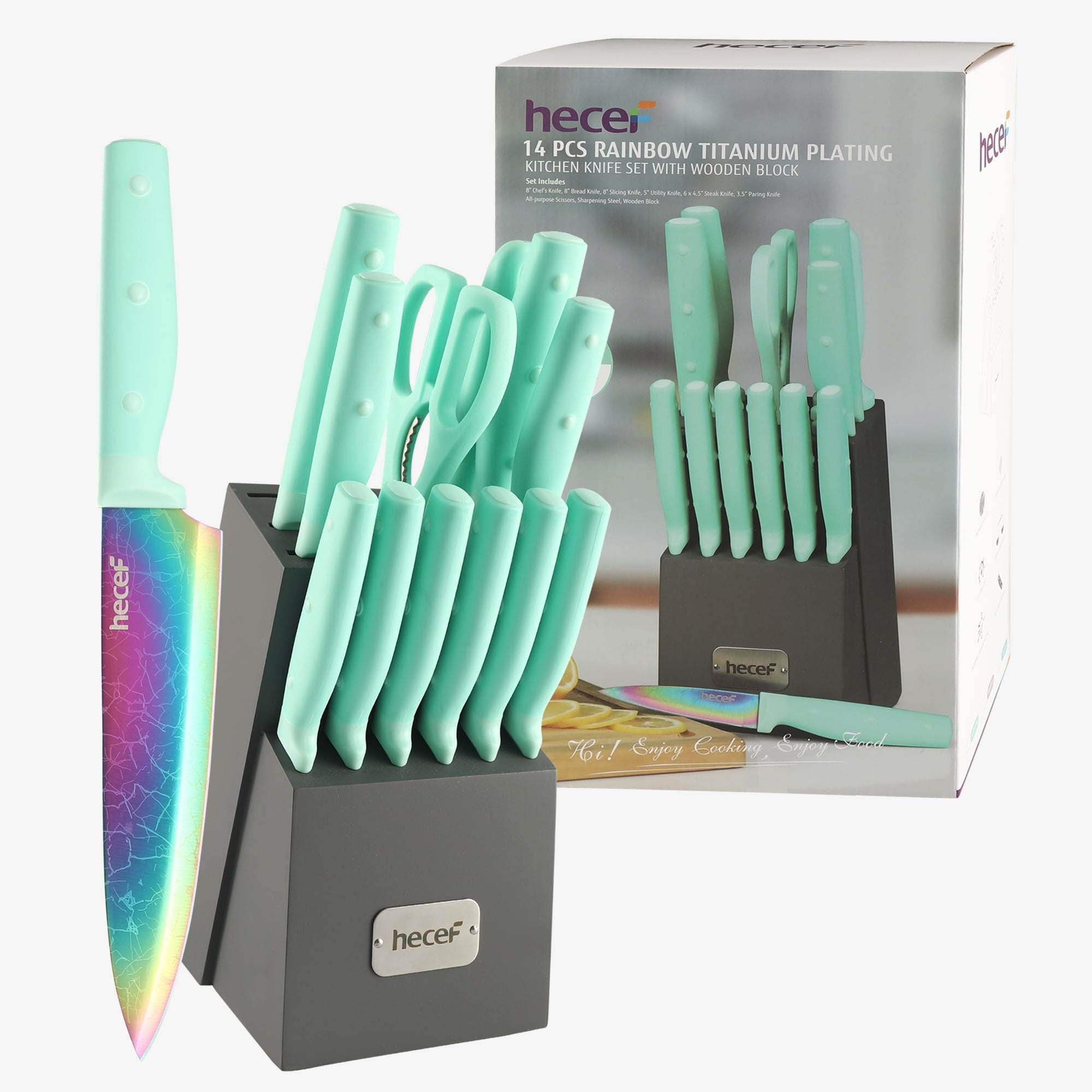 Hecef Dishwasher Safe Knife Block Set, Rainbow Titanium Coated Kitchen Knives Set with Scissors, Steak Knives Hecef Dishwasher Safe Knife Block Set, Rainbow Titanium Coated Kitchen Knives Set with Scissors, Steak Knives Hecef Dishwasher Safe Knife Block Set, Rainbow Titanium Coated Kitchen Knives Set with Scissors, Steak Knives