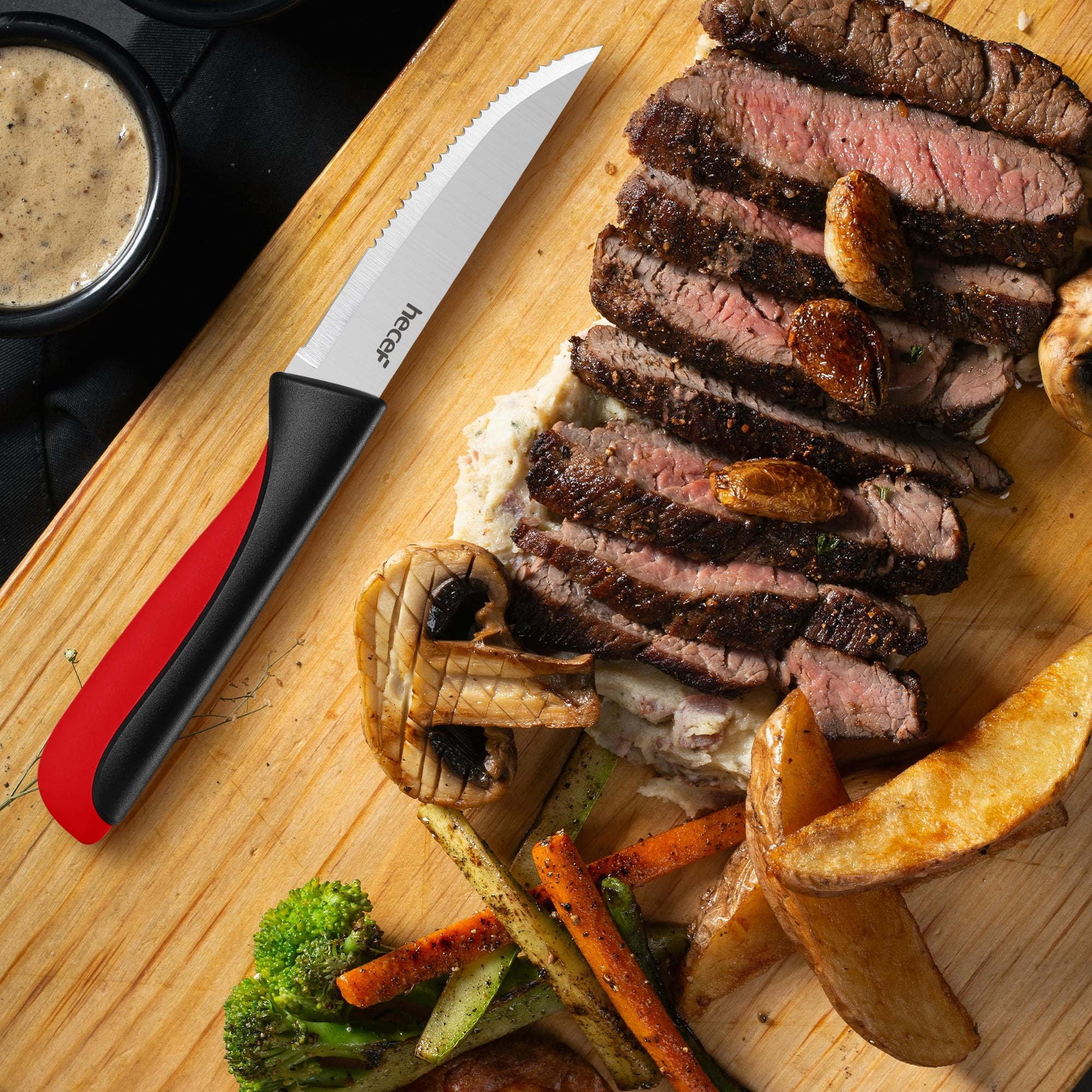 13-piece essential knife set: hecef 13-piece professional knife set meets all the cutting needs for kitchen, including: 8-inch chef knife, 8-inch cutting knife, 8-inch bread knife, 5-inch utility knife, 3.5-inch paring knife, 6 pieces of 4.5-inch steak knives, kitchen multi-purpose scissors and a solid knife block with a built-in sharpener, which is stylish and beautiful.