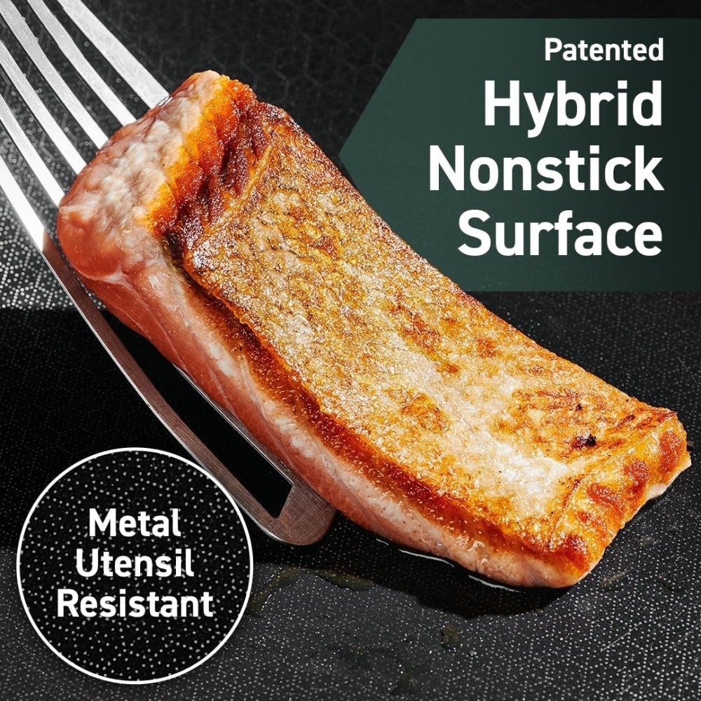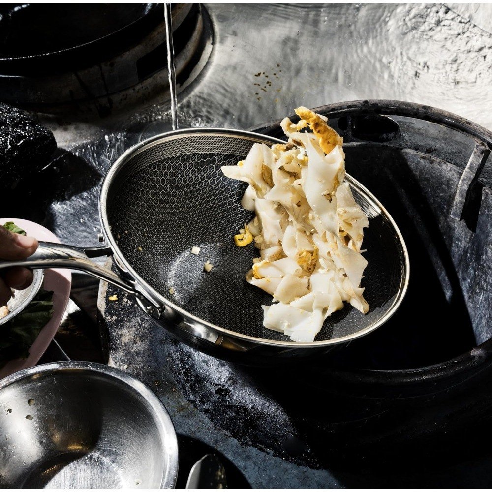 About this itempatented hybrid tech utilizes tri-ply construction – aluminum between two layers of stainless-steel - laser-etched with our hexagonal nonstick surface to deliver the searing power of stainless, durability of cast-iron and easy cleanup of nonstick.Made in the Cantonese style with two handles, our Hybrid 14-inch Wok delivers the high heat you need to stir-fry, deep-fry, boil and sear.Use your cookware on any home cooktop or stovetop, including induction. Every piece is also scratch-resistant, dishwasher-safe, and oven-safe up to 500°F. (Lids are oven-safe up to 400°F.)Your purchase includes one 14" Wok and accompanying Lid. The 14" Wok measures approximately 14 inches at the upper diameter, 7.5 inches at the bottom diameter, 3.5 inches in height and 6.5 lbs in weight.