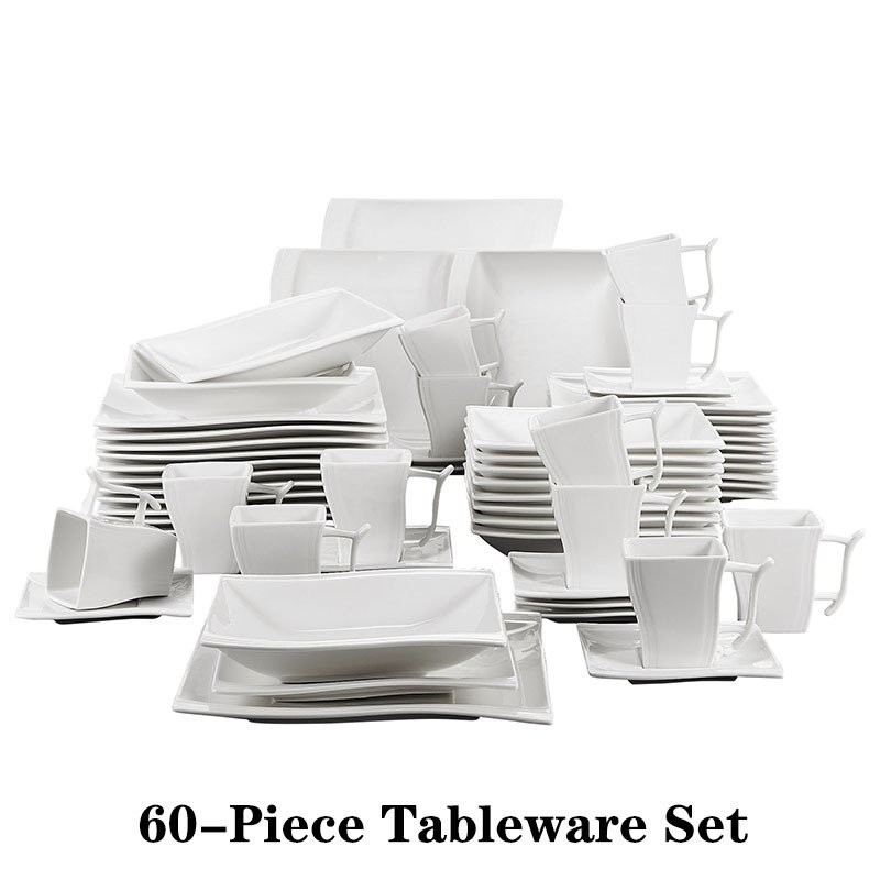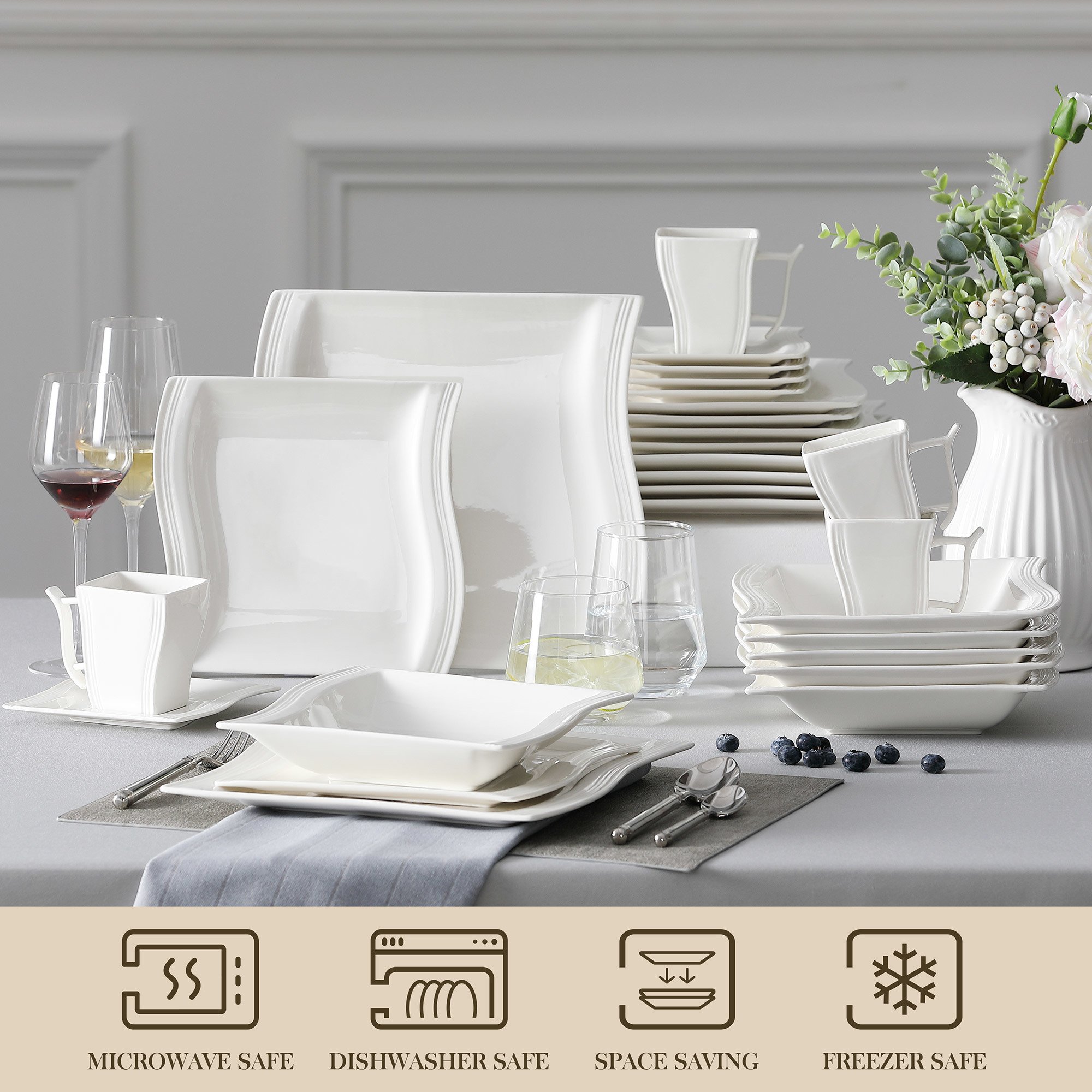Why choose Malacasa? ● MALACASA dinner service sets are made of ivory white porcelain, FDA certified lead and cadmium free for everyday use. With classic square shape, making the dining table beautiful and elegant.