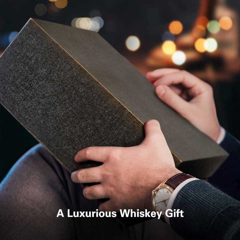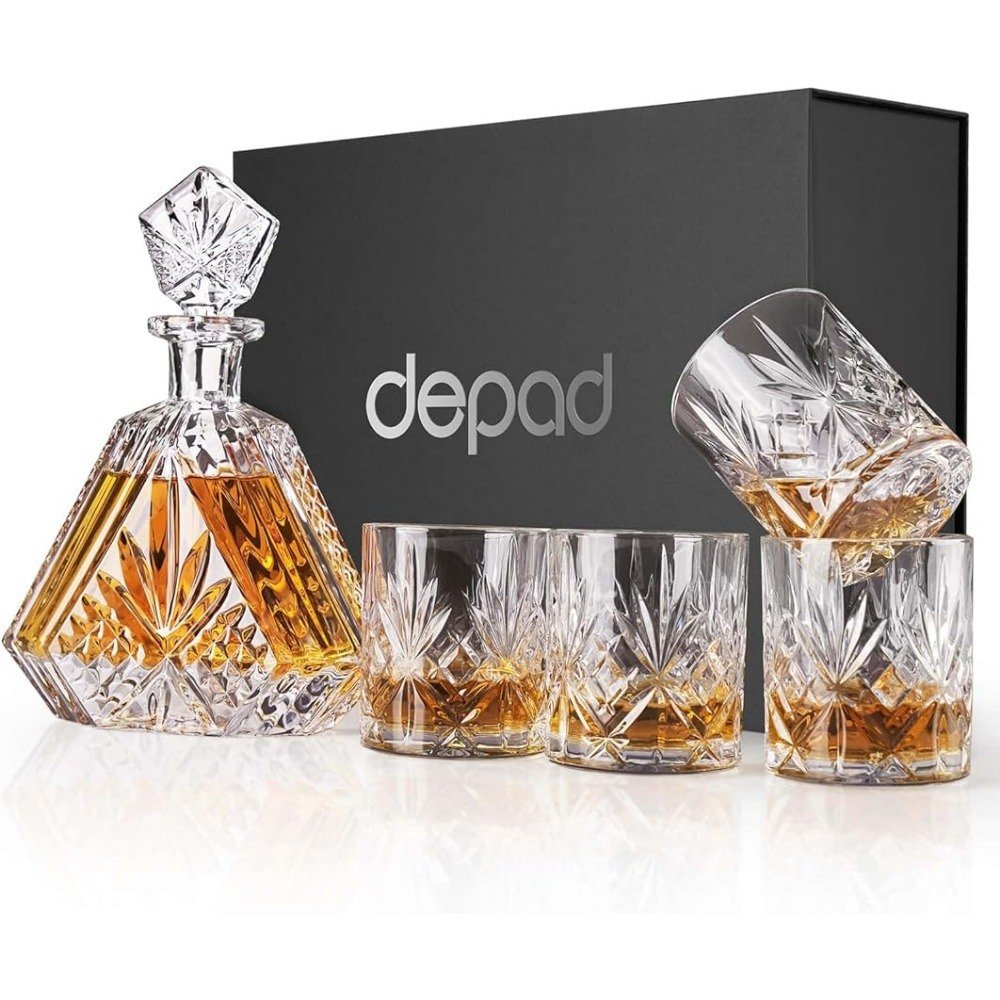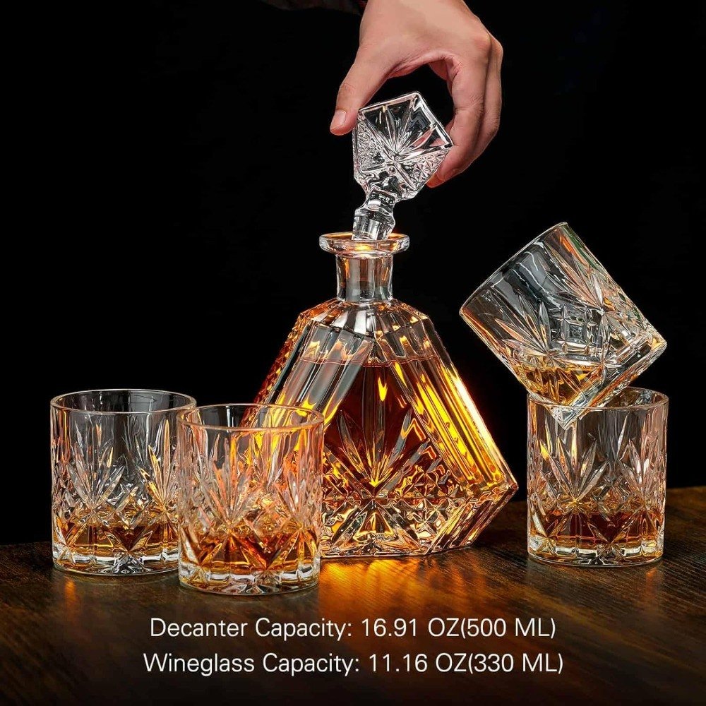 About this item[Durability and Sturdiness] The whiskey decanter sets for men is made of 100% lead-free safe glass. The decanter set is designed with thick sides and a solid base to ensure it won't easily break or chip. Its robust and sturdier design provides you a long-time service.[Perfect Holiday Gifts] This decanter set with glasses is wrapped in an exquisite gift box. It's a perfect gift for him men dad husband boss in weddings, birthdays, anniversaries, Christmas and holidays.[5-Piece Capacity] 1 liquor decanter with 4 matching whiskey glasses are included in this decanter set. The decanter capacity: 16.91 OZ (500 ML), the whiskey glasses capacity: 11.16 OZ(330 ML).[Elegant Details Design] This whiskey decanter set design is a wonderful craftsmanship. The decanter and glasses feature beautifully textured patterns, the glass stopper is airtight to keep your favorite wines fresh and the thick base keeps the whiskey decanter stable on a flat surface.[Suitable for Any Occasions] The elegant design makes this whiskey decanter set versatile. Not only can it be used for formal and casual occasions, but also can be used as a delicate ornament in your office or home.