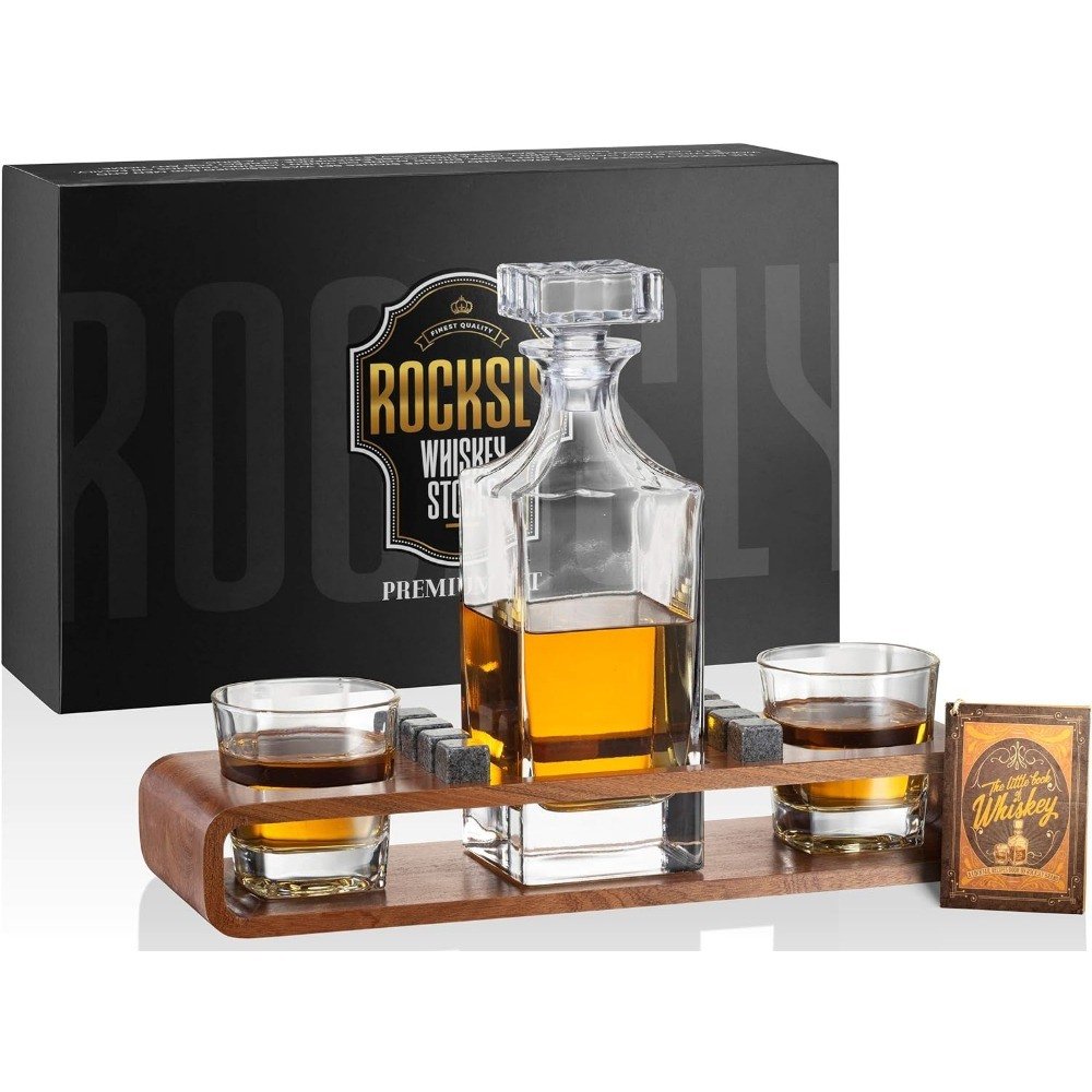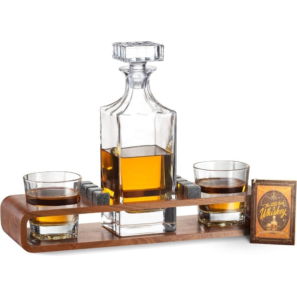 About this item✔ All-In-One Whiskey Decanter Set Everything your home bar needs in one attractive bourbon decanter set! The classic mahogany stand holds 2 heavy-bottomed whiskey glasses (10oz), whiskey decanter, velvet carrying bag, 8 whiskey stones, stainless steel tongs, and whiskey cocktail cards.✔ Organized and Attractive Display your decanter set proudly in this mahogany stand that keeps your bourbon decanter, whiskey glasses, and granite whiskey stones organized. You'll always find exactly what you need to pour a perfect glass of whiskey.✔ Chilled Whiskey, No Dilution These 8 granite whiskey rocks quickly chill your whiskey without affecting its flavor! Plus, they won't scratch your scotch glasses. These strong, reusable bourbon stones will be one of those scotch whiskey accessories you'll love for years to come.✔ Perfect Whiskey Gift Set This whiskey stones gift set for men makes for a truly epic present. Searching for whiskey gifts for men? This whiskey set will upgrade any occasion: Christmas, Birthdays, Anniversaries, New Year's, Thanksgiving, and Father's Day.